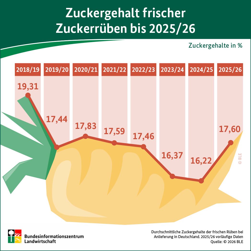 Nachdem der durchschnittliche Zuckergehalt in Deutschland im Jahr 2018 mit 19,3 Prozent einen Rekordwert erzielt hatte, wiesen die Folgejahre leicht unterdurchschnittliche Werte auf. Der hohe Wert im Jahr 2018 ergab sich durch das hinsichtlich Wärme, Sonnenscheindauer und Trockenheit mit „Dehydrierungssymptomen“ bei den Rüben („Rosineneffekt“), extreme Sommerhalbjahr. In der Kampagne 2024/25 verarbeiteten die Zuckerfabriken mit rund 33,5 Millionen Tonnen eine Rekordmenge an Zuckerrüben. Allerdings fiel der Zuckergehalt auf 16,2 Prozent. Betrachtet man den Zeitraum der letzten zehn Jahre ist dies der bisherige Tiefststand. Ein Grund für die niedrigeren Zuckergehalte 2024 bestand in den zum Teil regional überdurchschnittlichen Niederschlagsmengen. 2025/26 stieg der Zuckergehalt unter anderem aufgrund von vorteilhaften Witterungsbedingungen an und lag bei 17,6 Prozent.