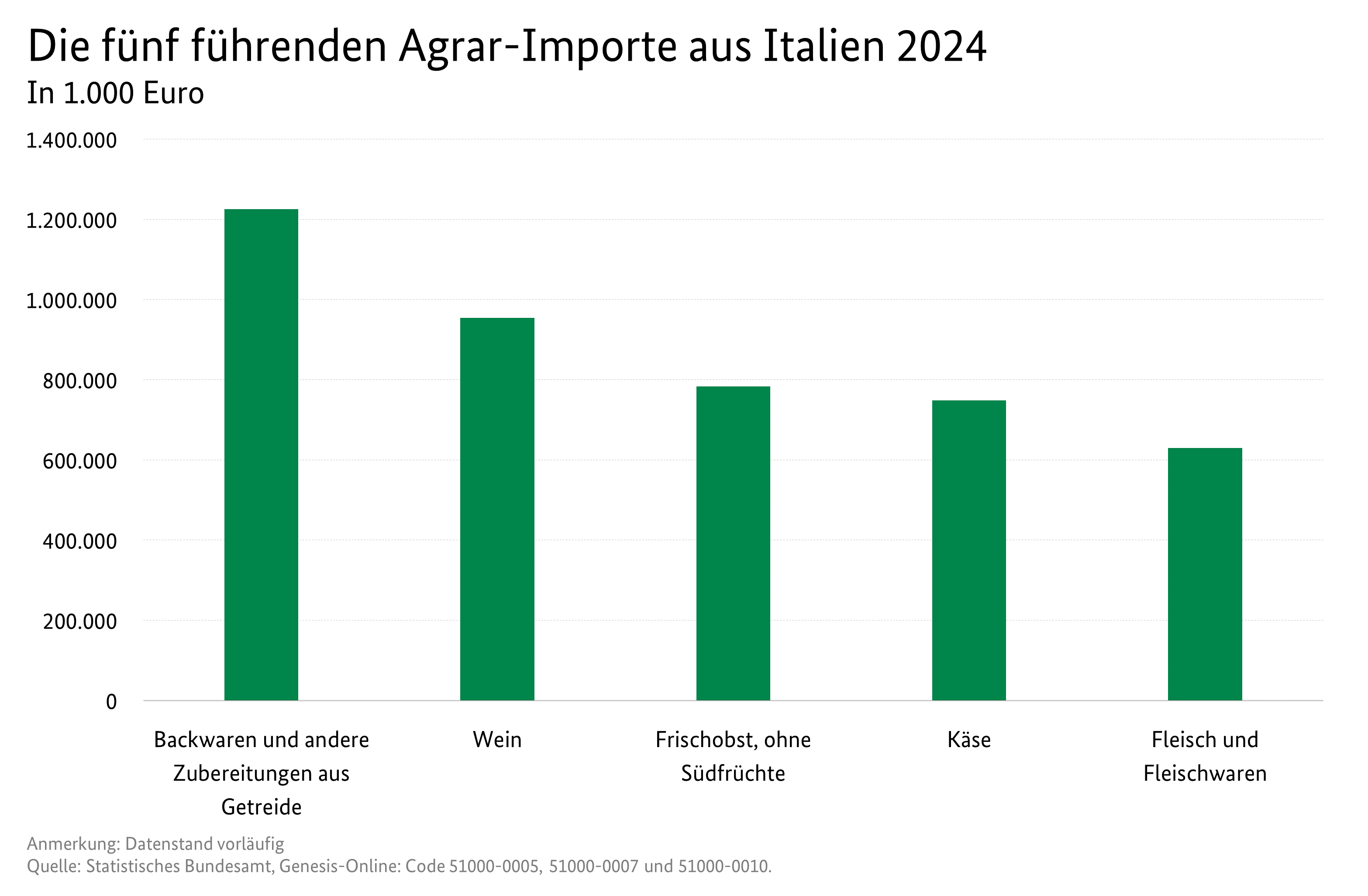Insgesamt importierte Deutschland 2024 Waren der Land- und Ernährungswirtschaft im Wert von neun Milliarden Euro aus Italien. Das entsprach rund vier Prozent der gesamten deutschen Agrar-Einfuhren.