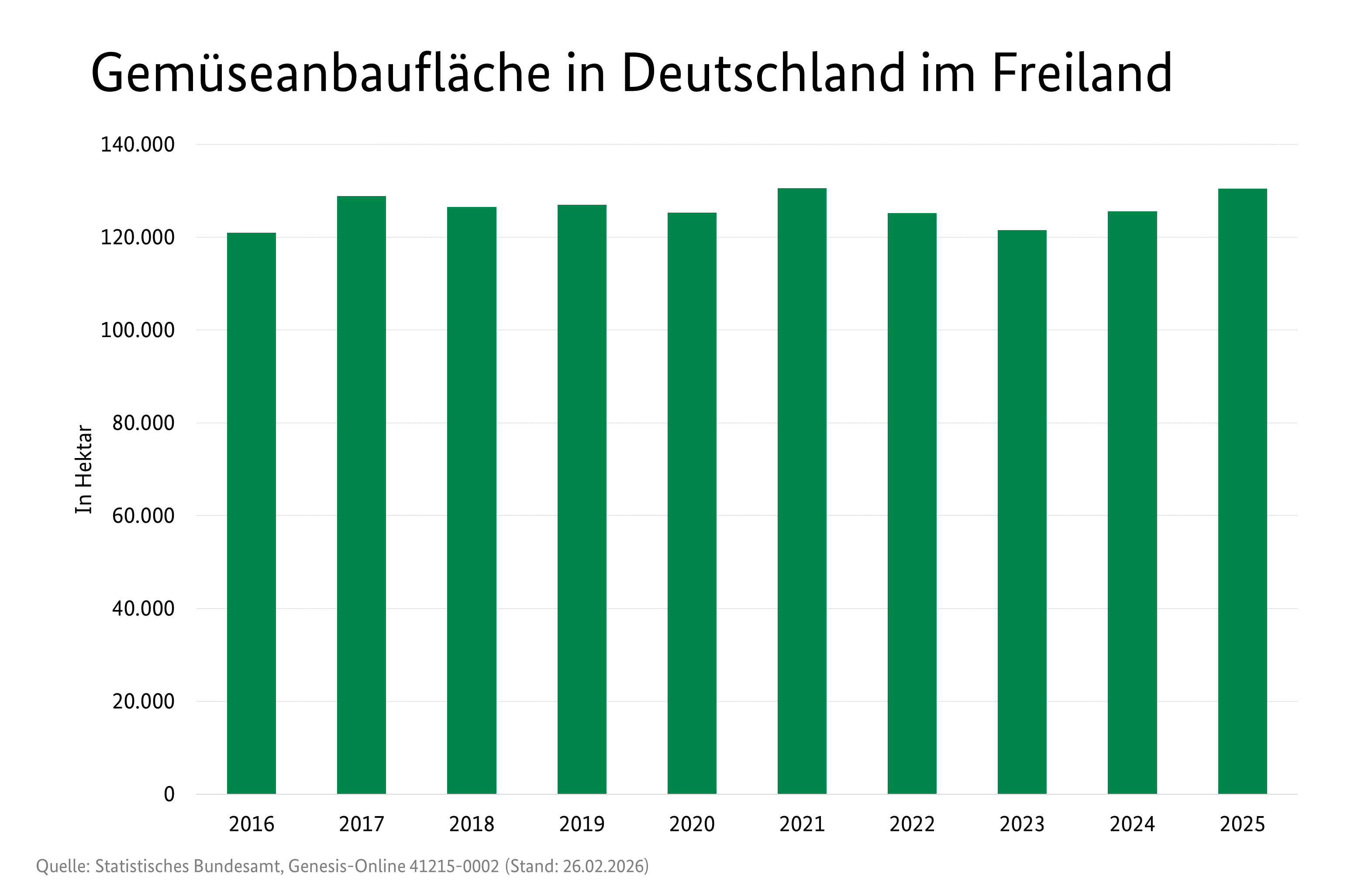 In Deutschland wurde 2025 Gemüse auf einer Fläche von 131.700 Hektar angebaut und rund 4,5 Millionen Tonnen geerntet. Das waren 8,1 Prozent mehr Gemüse als im Vorjahr und das höchste Ergebnis seit 1990.