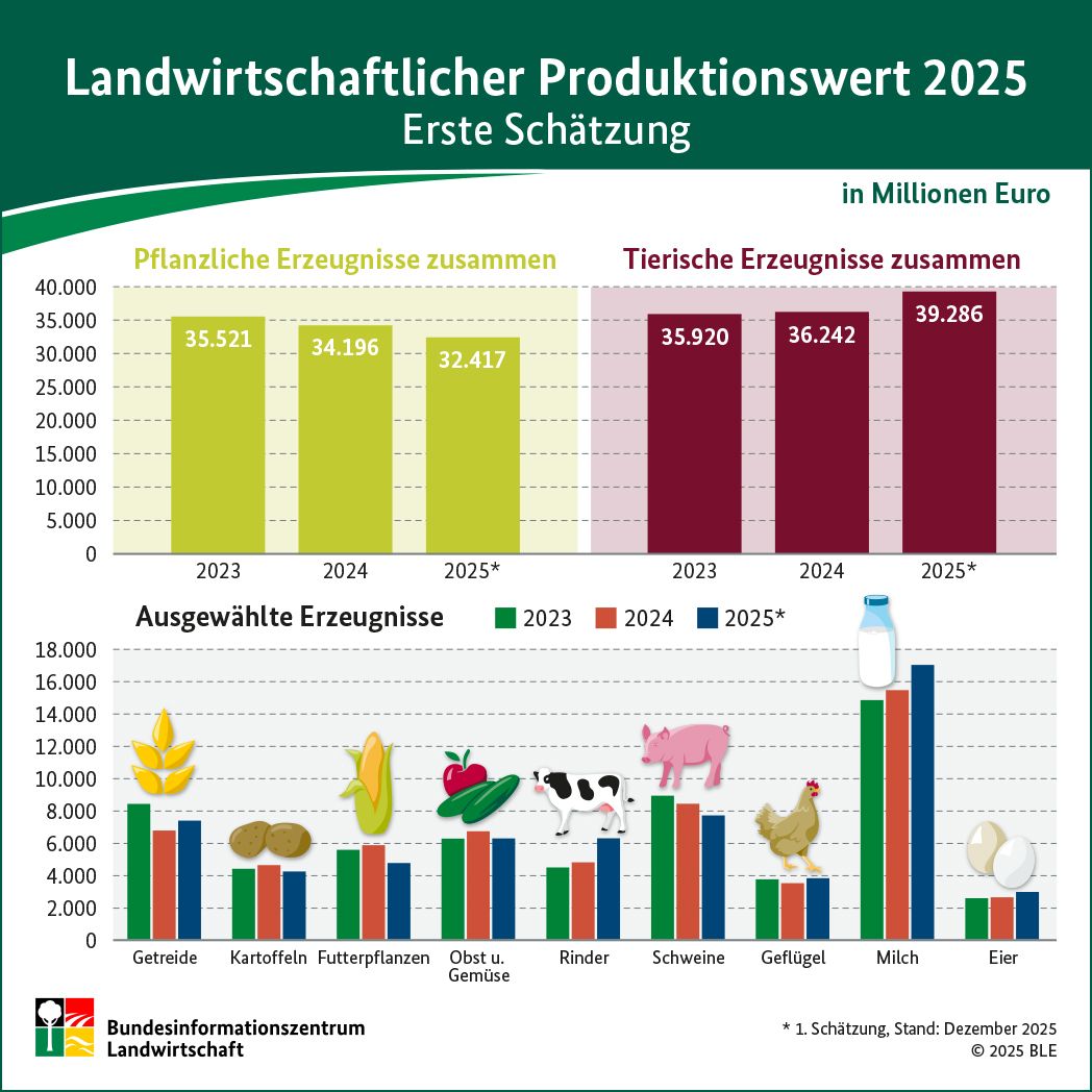 Laut erster Schätzung des Bundesinformationszentrums Landwirtschaft (BZL) belief sich der landwirtschaftliche Produktionswert in Deutschland im Jahr 2025 auf 76,8 Milliarden Euro. Im Vorjahresvergleich legte er um 1,3 Milliarden Euro oder 1,7 Prozent zu. Für das positive Ergebnis sorgten insbesondere die gestiegenen Preise im Bereich der Tierproduktion. Im Pflanzenbau war der Produktionswert dagegen rückläufig.