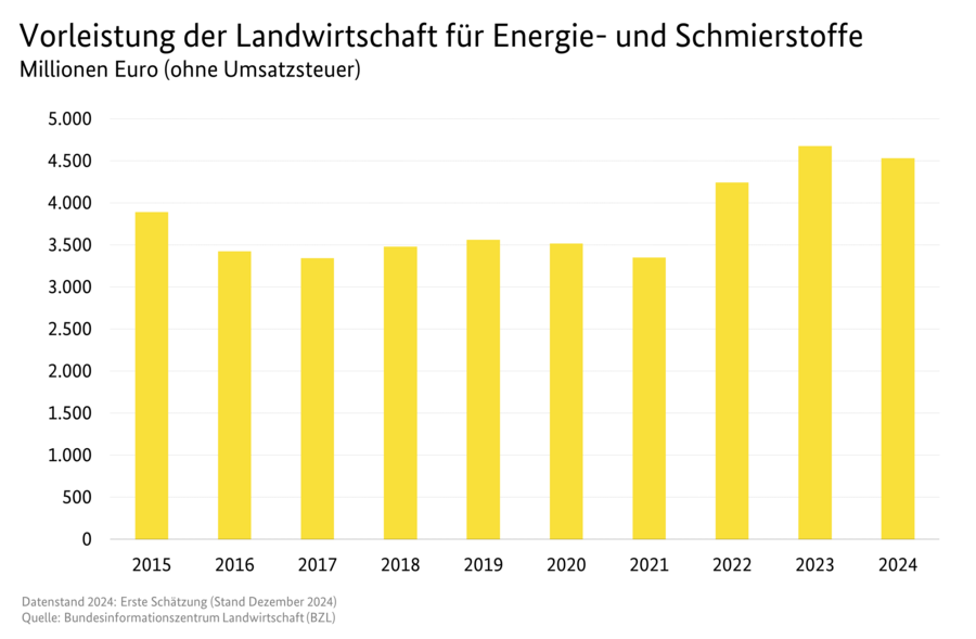 Im Jahr 2024 wurden für Energie- und Schmierstoffe Vorleistungen im Wert von geschätzt 4,5 Milliarden Euro (ohne Umsatzsteuer) getätigt, die der Energiewirtschaft und dem Handel zugutekamen.