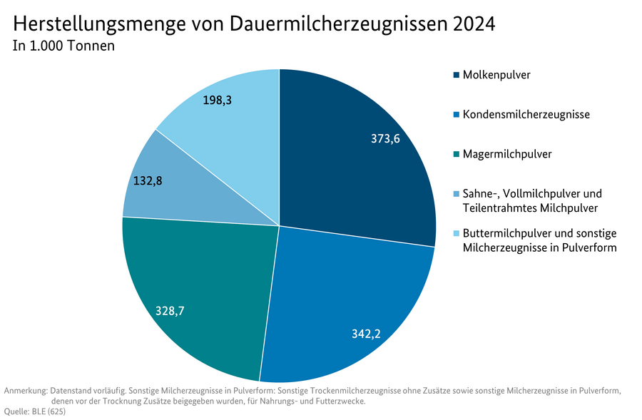 Die Herstellungsmenge von Trockenmilcherzeugnissen einschließlich Molkenpulver ist 2024 gegenüber dem Vorjahr um 2,6 Prozent auf rund eine Million Tonnen zurückgegangen. Im selben Jahr wurden 342.200 Tonnen Kondensmilcherzeugnisse produziert (+14,8 Prozent).