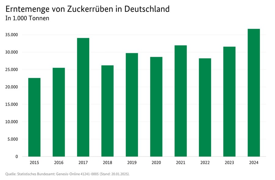 Auf 387.100 Hektar bauten 2025 nach vorläufigen Zahlen die Landwirtinnen und Landwirte in Deutschland Zuckerrüben an. Das entsprach 2,3 Prozent der landwirtschaftlichen Nutzfläche und 3,3 Prozent des deutschen Ackerlandes. Im Jahr 2024 haben 23.180 Betriebe Zuckerrüben kultiviert.