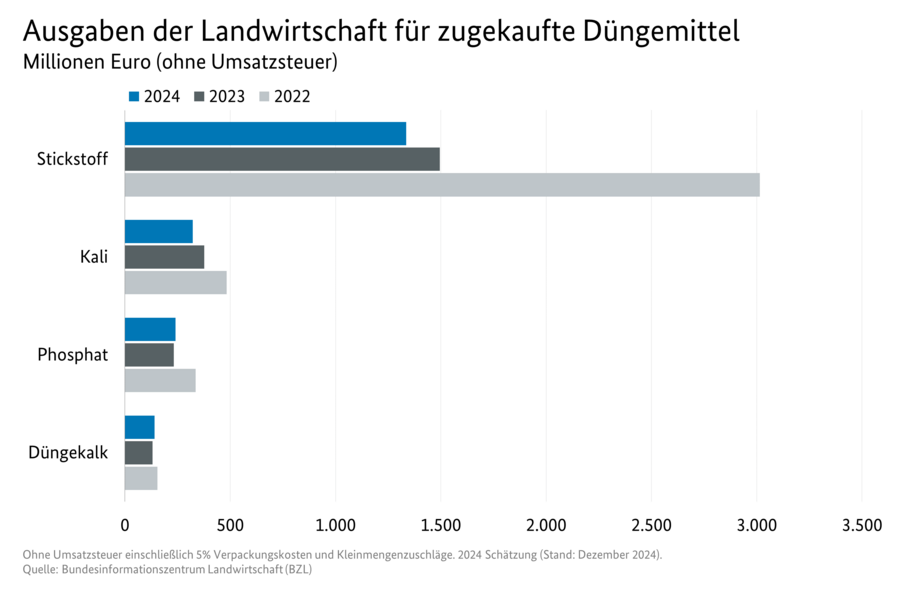 Die Ausgaben der Landwirtschaft für zugekaufte Düngemittel lagen im Jahr 2024 bei geschätzten zwei Milliarden Euro (ohne Umsatzsteuer). Damit waren sie um 8,7 Prozent niedriger als im Vorjahr. Fast zwei Drittel der zugekauften Düngemittel machte Stickstoff aus. Bei Phosphat, Kali und Düngekalk lagen die Ausgaben entsprechend bei 241, 322 und 141 Millionen Euro.